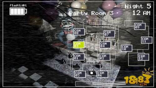 在界面的下方是两个带有双箭头的方框,鼠标移动到左边方框上是带上玩具熊头套,而右边是进入监控界面,里面有许多摄像机,用来随时监控玩具们的动向。在监控时按住Ctrl键可以打开手电筒,让你看得更清楚。