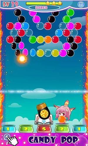 游戏由可爱的小女孩帮你填充糖果大炮,发射糖果消除泡泡获得高分!清除所有的泡泡即可通关,尝试在每一关获取三星好评吧!这款游戏虽然非常简单,然而如果想获得全部三星评价的话,也是很不容易的哦~~★★★★★玩法★★★★★1.点击任意位置发射泡泡;2.凑齐三个相同颜色的泡泡即可消除;3.连续消除可以获得高分。★★★★★FEATURES★★★★★1.400关解谜模式,挑战你的大脑!2.200关挑战模式,让你畅玩数周!