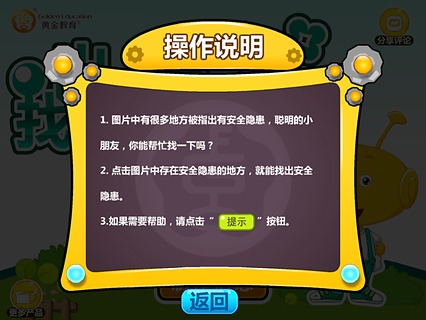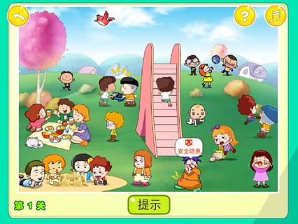 ?优质幼儿教育集团——'黄金教育'经典益智游戏iPad版发布;?点击图片中存在安全隐患的地方,通过游戏学习安全知识;?游戏一共分为3关,每一关都有不同的安全隐患。点击'提示',就能看到相关的安全隐患提示。游戏目的:学习日常安全知识,指导幼儿注意日常存在的安全隐患。游戏帮助:1、图片中有很多地方被指出有安全隐患,聪明的小朋友,你能帮忙找找吗?2、点击图片中存在安全隐患的地方,就能找出安全隐患。3、如果需要帮助,请点击'提示'按钮。关于黄金教育●0~6岁的优质教育就是黄金教育!黄金教育的理念就是'在最佳时机,用最佳的方法,让婴幼儿主动获得最佳发展(可持续发展)。'●在黄金教育时期,最好的学习,就是有目的地游戏;最好的游戏,就是愉快地学习。●黄金教育,遵循'学得无意、学得随意、学得乐意'的总体设计原则,特别为幼儿设计各类寓教于乐的趣味应用,让孩子在玩中学,学中玩,玩学结合,成就未来。欢迎关注我们的网站黄金教育数字平台:http://www.1248e.com黄金教育APP专区:http://app.1248e.com黄金手指幼儿园:http://www.ifunnykids.com...