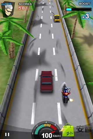 《狂飙摩托》游戏中你将进入一个引人入胜的摩托车比赛中.这里,你和别人比的将不是摩托车的速度,而更多的是你车技.游戏采用重力感应和触摸屏控制,满足你的冒险愿望.游戏特色:能够让你轻易上瘾的而游戏;灵活的重力感应控制;游戏以基本的物理定律为基础,更真实;30个越来越具挑战性的关卡.
