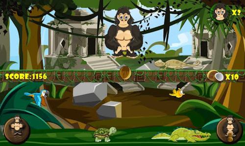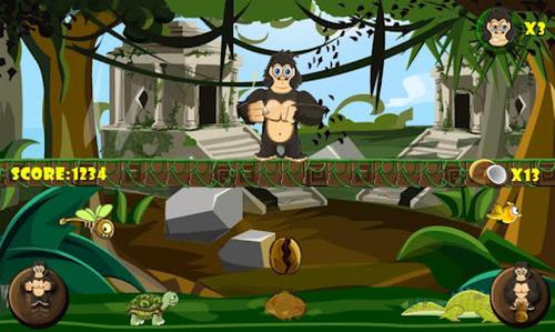 《愤怒的神庙大猩猩》是一款简单耐玩的休闲游戏,通过倾斜手机控制大猩猩在藤蔓上左右走动,需要玩家做的就是让它投掷椰球来击打地面上的动物例如鸟类和鳄鱼,这些都是加分项,但是乌龟不能砸,不然分数会减少。此外一定要注意的就是藤蔓上不时会有蜥蜴爬过,大猩猩必须跳起来闪避不然就减少生命值。游戏简单,画面也比较清新,随着时间的推移节奏也会加快,还是很具有挑战性的。