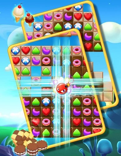 这是一个糖果狂欢派对,可爱,美味的糖果经典益智消除游戏!只需要将三颗以上的糖果排成一条直线,他们就能消除。玩法:交换两颗糖果的位置,使得相同的三颗以上的糖果横或竖排成一条直线即可消除糖果。将所有背景是空洞的方块都消除方可过关。时间有限,必须在规定时间内完成关卡。