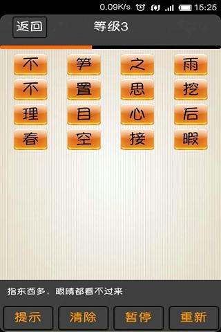 成语在语言表达中生动简洁、?形象鲜明。疯狂成语益智消除是一款休闲益智类小游戏,即丰富自己的成语知识,学习娱乐两不误,界面清晰,操作容易!进入主界面后依次点击文字,文字构成一个成语即可消除。在规定时间内消除所有成语即挑战成功升入下一级。游戏分为初、中、高三个难度等级,每一等级各有10关卡,必须依次挑战升级。