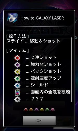GalaxyLaser(银河激光)是一款纵版2D飞行射击小游戏,游戏的画面还算不错,游戏中你需要不断的摧毁那些阻挡在你前面的敌人,每消灭一个敌人,你会获取一定的积分。游戏玩法:很简单,滑动手指来控制战斗机的飞行和射击。游戏道具:-红色方块:多重箭;-紫色方块:能量箭;-黄色方块:回转箭;-绿色方块:加快子弹射击速度;-天蓝色方块:防护盾;-彩虹方块:能够破坏所有的敌人;-黑色方块:???(不知道什么意思);-钻石:增加积分。v2.4.0更新内容:-新增了一个按钮;-修正了屏幕转换的错误问题;-引入了OpenFeint;-修正了其他的一些错误。