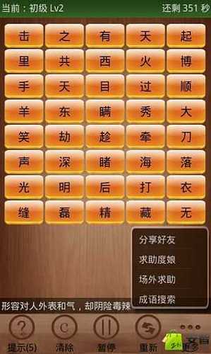 ★还在玩消灭星星,泡泡龙,连连看之类的游戏吗?何不换换口味!试试成语消消看吧!★★★★成语消消看是一款休闲益智类小游戏,界面清晰,操作容易,即可以在游戏中学习,又可以在学习中体验游戏的乐趣,丰富自己的成语知识,学习娱乐两不误,游戏分为初,中,高三个难度等级,每一等级各有10关卡,必须依次挑战升级.★★★★玩法:进入主界面后依次点击文字,文字构成一个成语即可消除.在规定时间内消除所有成语即挑战成功升入下一级.★★特色:1,戏分为初,中,高三个难度等级,每一等级各有10关卡,必须依次挑战升级.2,每次过关后都会提供一个笑话供你开怀乐笑。小妞,给大爷笑一个!3,,这是个考验人耐心的游戏,能好好锻炼你的耐力和定力。4,它是一款有助于挑战眼力及成语知识的游戏,玩家在玩的过程中不仅可以游戏带来的乐趣,还能学会很多的成语知识。★★★大家都知道多少成语呢?是不是感觉自己的成语知识不足呢?那就跟着我一起学习吧!展示自己的才华吧!★★★