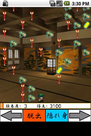你是一個忍者是能夠潛入敵人的城堡。獲得盡可能多的秘密捲軸和金幣,任務是破壞敵人已對你施加。為什麼坐在敵人,而不是有無數的攻擊箭頭。躲閃一輛華麗的馬車,利用固有的,隱藏自己的藝術]讓我們逃過一劫。遊戲介紹◎◎←,→移動按鈕的玩家。分數,100分滾動。橢圓形的是500點。1000點進入每個難度增大的程度。按鈕只有隱藏的,但你能避免下降列,然後,對於同時您將無法使用,一旦你使用。?當您按下逃逸按鈕,然後完成任務反饋。然而,使用後隱藏身體不能被用來一段時間。特派團將失敗,並打箭頭,所以成績不記錄,讓我們逃離的反饋按鈕,如果你覺得限制。◎◎版權所有?圖像在遊戲中,但讓我下面的網站使用不同的材料。董事會臼井這個網站的吳年跛行霍爾牛