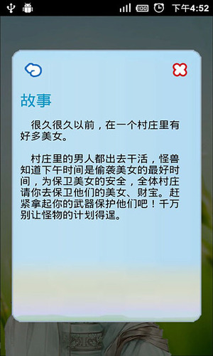 《保卫美女》是一个经典的塔防游戏。游戏的目的是建设塔消灭路过的敌人,防止他们抢走你的美女。当敌人被消灭,你可以得到相应完美。你可以用赚来的完美建立新的塔或强化现有塔。村庄里的男人都出去干活,怪兽知道下午时间是偷袭美女的最好时间,为保卫美女的安全,全体村庄请你去保卫他们的美女、财宝。赶紧拿起你的武器保护他们吧!千万别让怪物的计划得逞。