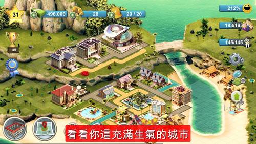 《岛屿城市4:模拟人生大亨CityIsland4:SimTownTycoon》是SparklingSociety?开发的一款模拟类游戏。全球最热门的模拟城市建造游戏系列《岛屿城市》已经释出全新续集,赶快下载到手机一起玩吧!全新一集的城市建造比以往更好玩,你将是一位大亨,将一条小村庄发展成一个岛屿,之后再透过发展数个岛屿,慢慢建立出一个大城市,过程中,你将需要发掘新岛屿、扩展你的城镇与城市、让你的市民住得开心、管理交通设施,以及接受不同的任务!而透过极緻细腻的图像与充满真实感的城市生活元素,比如不同的天气状况如下雪、下雨、晴天,还有日与夜,你的城市将活生生地呈现在你眼前!记得建筑物与装饰所摆放的位置要具策略性,以确保你的城市有充足的现金流持续发展。【修改说明】使用金币和金钱不减少反而增加!在游戏中选择香港的旗帜即可选择中文!