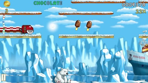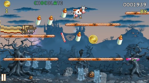 《彩虹猫:迷失太空》有着欢快有趣的形象和动作,并且带着2D像素风格的画面。配合上那首从头到尾都是“Nyan”的曲子,绝对是洗脑度十足。游戏的操作是简单直观的触屏形式,单击屏幕跳跃,双击可以二连跳。获得火箭超人等道具可以飞行的时候,直接按住屏幕然后移动自己的手指是控制飞行方向。玩的时候我们要做的就是不断的去收集各种蛋糕、牛奶、点心糖果,并且避开黑猫、飞碟、狗狗等等危险的家伙。
