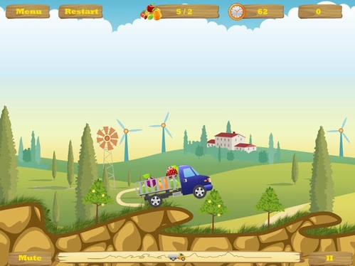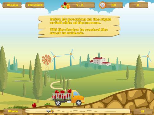 《欢乐卡车HappyTruck》是一款简单的休闲游戏。用卡车将尽量多的水果运送到市场。在运送的途中要特别小心,在指定的时间内将一定数量的水果运送到才能过关。送到的水果越多,那么得分就越高。按屏幕的左边和右边控制卡车速度,左右倾斜设备来控制卡车角度。