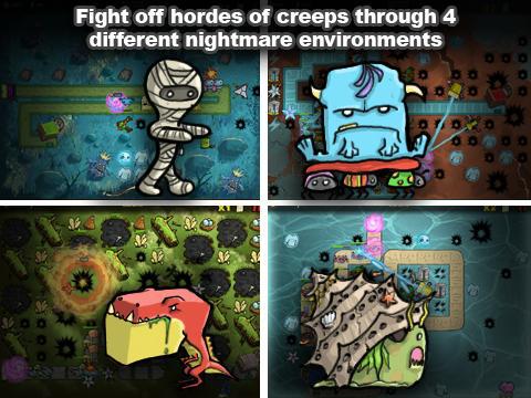 《恶魔出笼TheCreeps!》是一款有趣的策略塔防游戏。游戏玩法和保卫萝卜一样,但是摒弃了它所有可爱的萌系风格,转化为暗黑风。建设你的防御塔,守卫好终点的婴儿床,不要让那些恶魔靠近小孩,打扰他的睡眠。游戏场景中的任何物品都是可以击毁的,击毁它们你能得到一定的完美,升级你的防御塔。