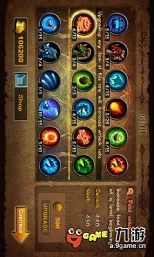 在很久以前,人类和龙和平相处,相安无事.但是人类皇帝自从听说吃龙蛋会让人长生不老就开始命令军队去猎杀龙,抢夺龙蛋.龙族愤怒了,人龙之战就这样开始了.而你是一个善良的人类,帮助这些无辜的龙族根据它们的特性去排兵布阵,阻止那些贪婪的人类!龙的种类和法术:火龙:用炙热的火焰攻击,它是最强大和最古老的生物之一.冰龙:用寒冷的冰可以暂时冻结敌人.毒龙:喷射毒液去攻击,接近它是非常危险的.火雨:特殊法术,降下火雨能覆盖一个小区域.1.1.4版更新信息:1.修复某些设备崩溃的问题;2.如果游戏依然崩溃请把声音关掉.