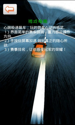 一款非常好玩时尚的极速飞车,心跳极速飙车,玩的就是心动的感觉.1)界面简单的赛车游戏,重力感应操作方向。2)手按住屏幕加速,做好真正的随心所欲.3)赛事排名,让你感受冠军的荣耀!心跳急速赛车,玩的就是心态的感觉喔,亲!