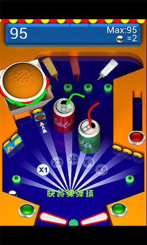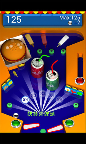 这款游戏以弹球为题材,以快餐为背景,游戏中玩家需要发射各种弹球挑战积分,积分越多那么你获取的汉堡和可乐就越多,所有为了满足自己的口腹之欲,赶紧挑战吧!1、玩家点击“开始”直接进入游戏画面;2、点击界面右下方屏幕不松手即可控制弹球射击力度,松开手指即可射击;3、钢球在画面中滚动,玩家点击屏幕任意位置即可控制跳板移动射击;4、击中汉堡位置的按钮即可获取各种食物哦;5、界面上方显示玩家的积分!