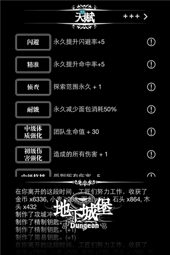 iOS口碑佳作、AppStore付费榜第一的探险经营RPG手游《地下城堡》降临安卓。====================================《地下城堡》是一款暗黑风格的模拟经营与迷宫探险游戏。只身一人,闯入黑暗世界,等待你的只有未知的恐惧,幸好有一座废弃的古堡和古老的炼金阵。开采资源、建造的各色建筑、收留投靠的工匠、制作兵器、训练出征的战士、探索未知地域……你在黑暗世界的冒险奇遇由此展开。在这里,你要想方设法获取资源壮大自己的城堡,招募神秘的英雄和远古魔龙,不断打造最强兵器和职业兵种,深入庞大的黑暗世界进行冒险和掠夺。终极迷宫——永恒竞技场已为下一个黑暗挑战者敞开大门。进入游戏,属于你的黑暗世界正慢慢展现……===========游戏特色=========1、挂机放置玩法,打开游戏就能收获大量资源2、10层地下迷宫世界,500+个探索地点,战斗风格迥异的怪物3、50+兵种职业,各具风格,战法牧任意搭配4、复古的暗黑文字风格,用想象构建你的庞大黑暗世界多重好礼恭迎探险勇士:每日签到送限时好礼、首充任意金额送千金币、每日微博微信分享得钻石、进Q群:257848145得礼包、加微信:dixiacb赢话费奖励、社区签到送礼包……更新日志