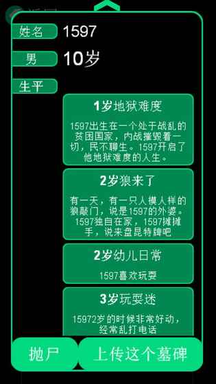 这是一个有关人生的游戏,玩家可以创建自己的角色,在这个逗比的社会中经历一生。死后还可以将自己的坟墓与朋友分享。游戏内事件会根据角色的选择发生改变,一些事件也会随机发生。事件全靠玩家贡献,你也可以将你的想法,提交给作者,写进游戏中。游戏特色