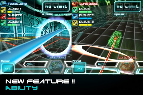 操作方面,游戏采用了虚拟按键的方式。屏幕左右的两个箭头控制着左右的转向,左下角的boost是加速,右下角的Jump控制跳跃,两者都有使用冷却时间。游戏的规则很简单,通过不断的移动和改变行进方向,在自己身后留下光之轨迹,来迫使对手进入绝境,撞上你所留下的光之轨迹,即可获得胜利。多留心右上角的小地图的位置提示,这对你把握整个局面会有很好的帮助。