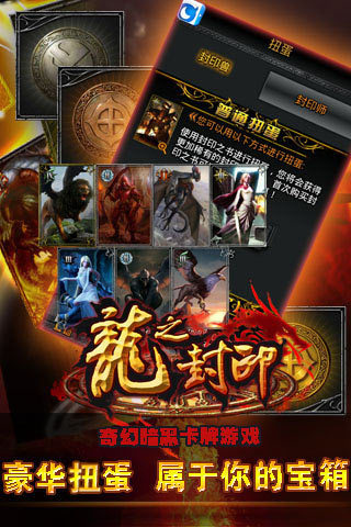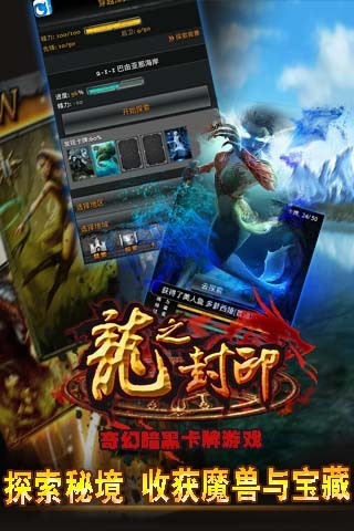 《龙之封印》是一款卡片对战游戏,玩家在游戏中扮演一名魔导师,统率由数以百计的卡片组成的部队进行探索和战斗。卡片分为封印师(人类指挥官)和封印兽(龙、怪兽等各种生物)两种,玩家将指挥这些卡片,去面对那些妄图破坏七贤者的封印,并统治整个艾格大陆的邪恶力量。游戏特色:★拥有超过350张精美绝伦的卡片,由10间著名工作室的30多名天才画家一手打造,完美地平衡了写实和虚幻风格。★简单而又颇具深度的战斗系统,配上华丽激烈的战斗动画,策略性十足。★丰富多彩的探索地图,广袤的平原、炽热的火山和古老的城堡,任君探索!还不赶快加入冰与火交织、刀剑与魔法争锋的奇幻国度!★本款游戏为手机网游,建议在wifi环境下使用★