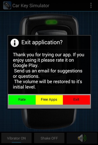 车钥匙模拟器是一个很不错的恶作剧你可以在你的朋友一起玩:它模拟一个车钥匙,让你:*使汽车报警器的声音;*假装你可以在与真正的汽车钥匙(隐藏)使用它完美一个真正的汽车;按压卡奇一个按钮时,LED指示灯会由绿色变成红色信号,即卡奇工作,并发射无线电波。恶作剧你的朋友,一辆车可以用这个车钥匙完美!请记住,这个程序只是出于娱乐的目的!这车钥匙是加强与振动和屏幕震动效果。如果你愿意,可以把这些关闭。通过电子邮件,短信,Twitter或Facebook分享这款车钥匙模拟器与您的朋友。保持按钮手指不断听到报警声。你可以切换关闭震动,摇晃,甚至使声音更响亮,如果手机尚未设定。请理解,这个应用程序包含的广告,以便让我们能够进一步为您开发有趣的应用程序。如有其他问题,建议,请给我们发送电子邮件。谢谢你和享受!