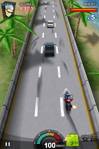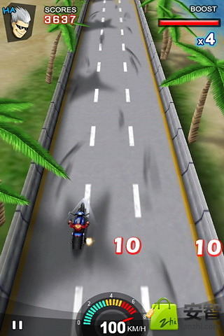 《野蛮摩托(RacingMoto)》是一款快节奏竞速的安卓经典游戏,玩家可以选择自己喜欢的摩托车,在交通高峰时间内驰骋在高速路上,不断向前冲刺,在旅途中还可以欣赏城市,桥梁,海上和森林等美丽迷人的景色.游戏方法很简单,倾斜手机来控制摩托车方向,点击屏幕加快速度.如果想得高分,必须要不断加快摩托,同时,集中精力观察指示灯,车辆可左转或右转,到50000分后,不要急于冲刺,以稳为主