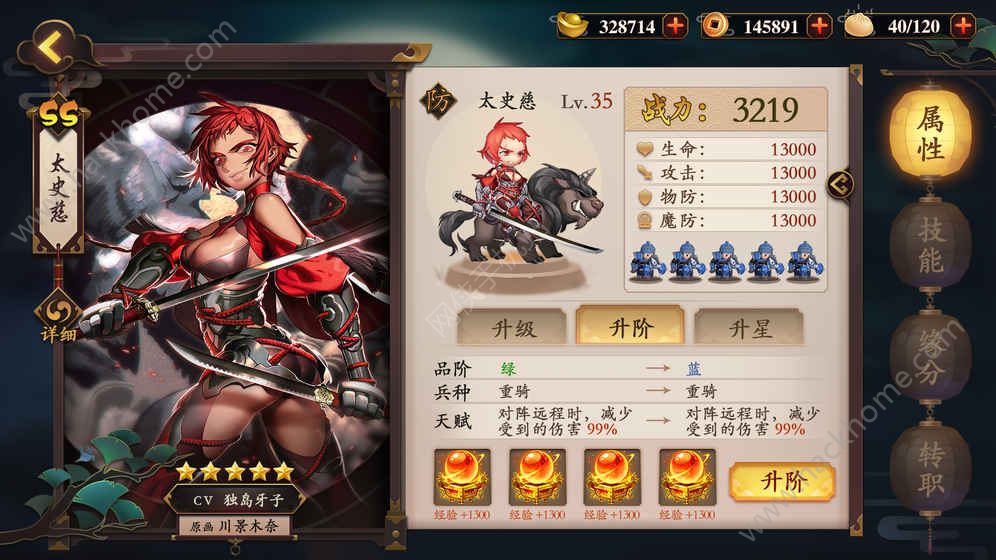 3.常见的升级、升颜色、升星不多说啦,特色是增加了转职系统,会对武将的技能和奥义产生影响,使同一个角色有更丰富的发展路线。