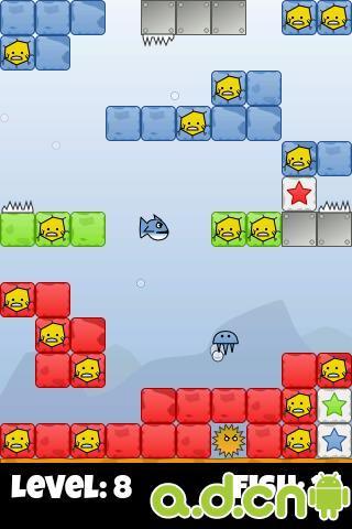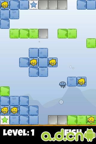 Android平台上的一款免费的益智游戏,它的类型总的来说与打砖块有一点类似,都是通过发射一个物体将游戏界面中的砖块打碎。但是这款游戏的玩法和打砖块是完全不一样的,这是一款重力感应控制的游戏。游戏的主角是一只不断游动的水母,你需要用控制感应来控制水母的游动。游戏中还有一些鱼被果冻粘住了,你控制水母去撞击那些果冻,将被困住的鱼释放出来。游戏中你还需要小心在四处出没的鲨鱼。