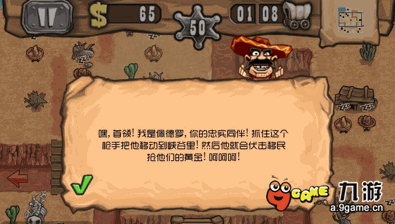 这款Guns'n'Glory以反派的视角为题材,让玩家体验到作为西部荒野大盗的感觉.游戏的画面以细致的2D手法来展示,无论是拉远或者拉近视角,你都能看到令人满意的画面效果.游戏的场景充满了各种美国西部电影的要素,黄沙飞扬的荒地、高大的仙人掌、在铁轨上呼啸而过的火车,还有西部电影里最常见的大篷车和带着疯狂的西部大盗们,能让你感觉到十分棒的西部电影的感觉.