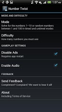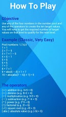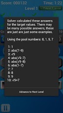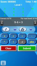 如果您认为你的数学很强劲的话,那赶快来挑战吧,挑战全球最高分!这是一款数学运算游戏,游戏里面的号码池里面有四个数字给你,可以利用加减乘除方法算出他们的等值,在限定的时间内算出的话即可进入下一关!很具有挑战性的一款数学游戏噢!而且即时刷新全球排行榜。游戏特点:OpenFeint的成就和排行榜4游戏模式4游戏困难运算方式演示:(+):addition(e.g.3+5=8)(÷):pision(e.g.8÷2=4)(*):multiplication(e.g.3*3=9)(-):subtraction(e.g.7-4=3)(^):power(e.g.2^3=8)(!):factorial(e.g.3!=6)(√):squareroot(e.g.√9=3)(abs):absolutevalue(e.g.|-5|=5)