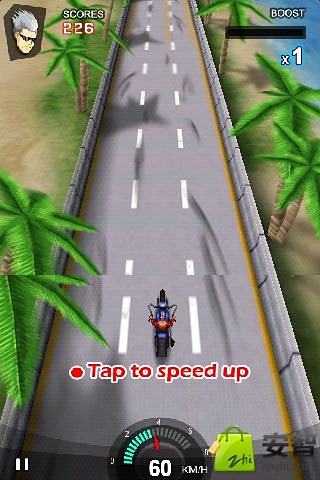 摩托车的引擎声和转弯时轮胎与地面摩擦而产生的声音.而且它在游戏中加入了对抗成份,比赛中玩家可以使用拳,脚去干扰对方,使其落后,而且对手会主动攻击.如果遇到开摩托车的警察,虽然也可以对他踢上一脚,但可得小心点,万一被捉住了,那就游戏结束了