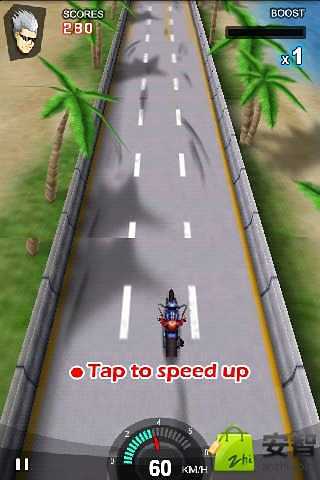 竞技摩托是一款经典快节奏的竞速摩托游戏,玩家可以选择自己喜欢的摩托车,在交通高峰时间内驰骋在高速路上,不断向前冲刺,在旅途中还可欣赏城市,桥梁,海上和森林等美丽迷人的景色.游戏方法很简单,左右倾斜手机来控制摩托车方向,点击屏幕加快速度.如果想得高分,必须要不断加快摩托,同时,集中精力观察前方车辆方向指示灯,辨别车辆是左转或右转,到50000分后,不要急于冲刺,以稳为主.