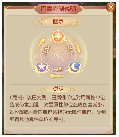 5)克制系统:每种丹青都附带日、月、星丹青属性;根据随从携带的丹青,随从会被赋予不同的丹青属性,各个丹青属性之间存在克制关系;江山画卷中的怪物会携带丹青属性,搭配不同的丹青,对于通关关卡将非常重要;克制系统只在江山画卷中生效,不带入其他战斗中。