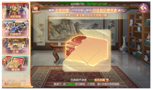 3)招募界面新增藏宝阁:每进行10次四海朝贡,即可在藏宝阁解锁一片拼图,每解锁一块拼图可获得一份奖励,解锁全部拼图,将获得终极大奖;拼图将会在每周一0点重置。