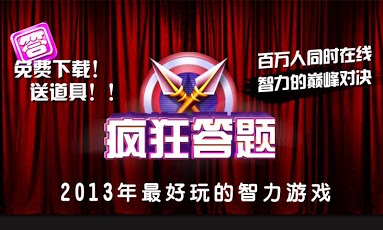 2013年最好玩的益智答题对战游戏《疯狂答题》重磅上线,全新的玩法,百万真人在线对战,练就战神的神级秘诀,这里将是智慧的最高巅峰对决,你还在等什么呢?快点来体验吧!这里有最绚丽的舞台效果、最紧张刺激的答题过程,丰富的题库系统,具有8000多道题,让你体验答题的乐趣!游戏玩法:1)练习模式:和机器人进行对战,进行闯关答题练习2)快速模式:快速匹配一个在线的玩家进行PVP对战3)好友对战:不仅可以邀请你的QQ好友来进行答题对战,还可以和已经加入的QQ好友进行答题PK,一决高下!产品特色:★最绚丽的舞台效果,有身临现场挑战的幻觉★最动听的背景音乐★最紧张刺激的在线真人之间的智慧挑战★丰富的题库系统,具有8000多道题覆盖各个行业的常识★每周进行题库的更新,实时热点、娱乐新闻等各种行业的题库★集娱乐、益智、教育于一体的老少皆宜的益智答题游戏★想不再面对冷冰冰的机器对战了吗?★想体验激情与激情的碰撞吗?★想通过自己的庞大知识储备来决战巅峰吗?★这一切,尽在'疯狂答题'联系方式:邮箱:lijun@yizhandaodi.com商务QQ:1766734268