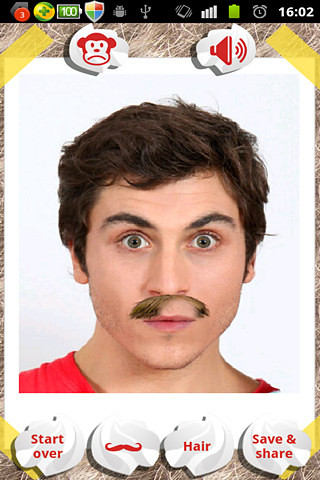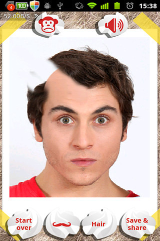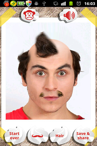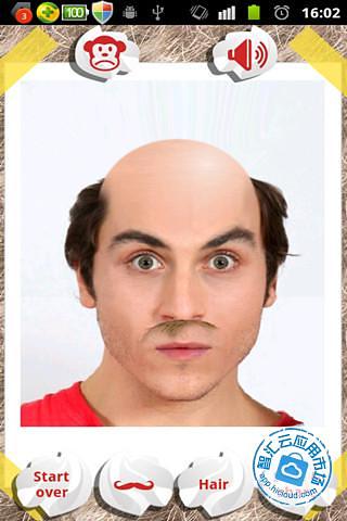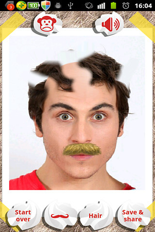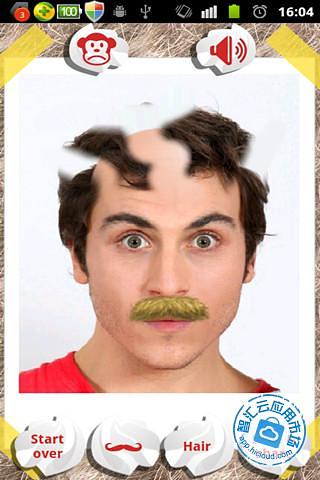 游戏中,屏幕上显示的人,可以从自己相册里任意选择,也可以立即拍照。定位某个人,然后给他设计发型,也可以选择拍照模式,定位眼睛和嘴巴的位置,然后再开始剃头发。还可以给他(她)贴上胡须,哈哈!另外,还可以将设计好的人物头像保存分享到微博、空间等,看你能给他(她)剃成什么样子吧。