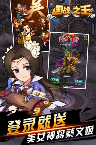 【登录就送美女神将】登录就送紫色神将“蔡文姬”,主公征战路上不再寂寞;【海量完美疯狂放送】首周上万完美大放送,紫装紫将送不停;【平民玩家大R享受】独创“装备打造”系统,让神装离玩家不再遥远,真正的良心游戏;【24小时国战,让我们战个痛快】国战系统全天开放,万人实时国战,再现烽烟四起的三国争霸的盛世;