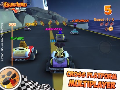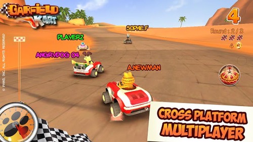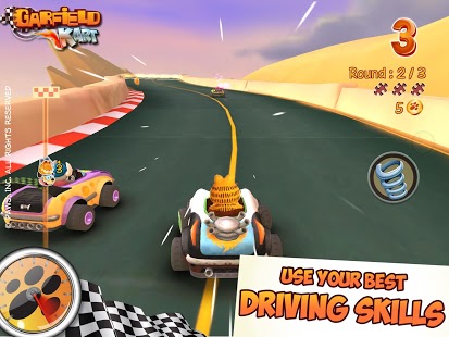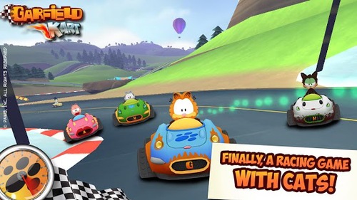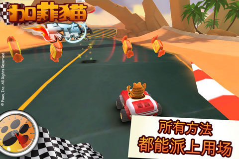 经典的动画角色加菲猫又与玩家们见面啦,这一次加菲猫将驾驶着卡丁车疾驰在赛场上,而除了好吃懒做的加菲猫外,小狗阿德、奈梅尔、乔恩等也会悉数登场。《加菲猫卡丁车GarfieldKart》包含了16个风景秀美的赛道,而道路两旁的场景也将紧扣加菲猫动画进行设置,让玩家在赛车之余能够重温童年的美好。在游戏中我们可以选择重力感应或是触屏两种控制方式来飙卡丁车。游戏主要两种操控:第一种是重力操作,配合刹车和漂移的虚拟按钮;第二种是在屏幕左下方直接显示左右转弯的按钮,刹车和漂移的按钮不变。在比赛时,玩家会捡到不同的道具,这时候可以看到道具使用按钮,点击可以向前发射,点击按钮下方的箭头,则可以把道具丢在车后,攻击后面的敌人。游戏模式包括传统的生涯(计时、排位赛)模式,生涯模式也有3档不同的难度,而且是采用cc容量来表达,容量越大难度越高。在比赛中,玩家会在赛道捡到很多完美,胜利也会获得完美奖励,完美可以能购买更好的车和人物,给车加上不同属性的尾翼等等,还能有额外的道具,让玩家在比赛时争取更好的名次。