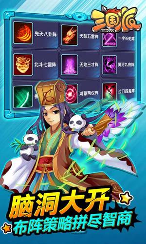 东汉歇菜大学里...刘小备被吕小布痛打了一顿,哭着回去找关小羽和张小飞,三人抄起家伙准备逆袭。不料吕小布却被曹小操一派踢出了学校...孙小权继承姐姐大队长的职务,慢慢发展自己的势力。校长不忍学校纷乱愤然离去,从此学校里便只剩魏蜀吴这三派势力...新来滴,你似哪派哒?!!创新玩法枭雄模式:独自征讨天下,70多场大战待你发威!共讨模式:集结本派诸侯共打天下,盟主由你担当!武将系统:上百位名将等你征召,赏赐神兵养专属武圣!智者天下:10种阵法,50多种技能助你轻松破敌!游戏特色全新画风精美绝伦随音乐步入萌系三国场景,超完美的画面,超精细的画风,带给你的不仅是与众不同的视觉体验,更是无法言喻的喜悦感受。Q版造型萌翻大众各路英雄豪杰大变身,无论是乱世枭雄曹操,还是美若天仙貂蝉,超Q的新颖造型,*完爆你的眼球。变幻莫测智者天下激烈华丽的战斗中,深谙策略秘诀,方能百战百胜。变幻莫测的多样阵法,极度考验你的智商,斗智斗勇中,更易激发你的战斗性。高手博弈,谁是王者?全新手游,全新体验。2014年,一样的三国,不一样的《三国派》。
