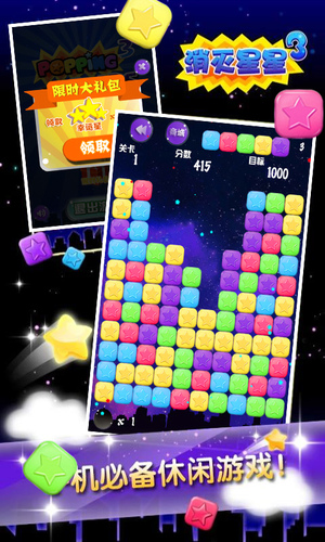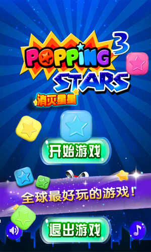 本游戏根据最新最好玩的《消灭星星3》精心制作的精装版本。这是一款画面精美的星星消除游戏。你的任务是将同颜色连接在一起的星星消除.只需点击两个或两个以上颜色相同的方块即可消除。没有时间限制,每个阶段都有一个目标,完成即可进入下一关。同时还有2种道具使用(炸弹,变色星)。快来体验下吧!