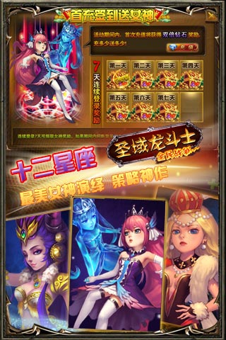 12星座女神下凡与玩家们一起在游戏中热血奋战◆视觉冲击---精彩绝伦的圣域之城,细腻唯美的场景建筑,尽享西方魔幻奇妙世界!◆心脏剧震---无比刺激的探险之路,凶残狂暴的远古巨兽,尽显圣域第一骑士美誉!◆谁与争锋---万千英雄的成长之路,千变万化的阵型搭配,尽在领主运筹帷幄之中!◆千种玩点---英雄培养,符文幻化,装备锻造,公会战争,直击顶端手机策略网游!