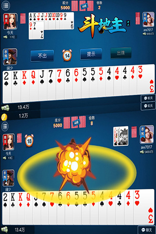 《中大斗地主》游戏玩法经典、操作简单、界面又好,是当代网民最时尚的选择。棋牌游戏打法更加新颖独特,技巧要求更高。由爱玩科技公司出品的中大斗地主、欢乐五张、四人牛牛、二人牛牛是非常经典好玩的几款大众游戏。游戏规则:发牌:一副牌54张,一人17张,留3张做底牌,在确定地主之前玩家不能看底牌。叫牌:叫牌按出牌的顺序轮流进行,叫牌时可以选择“叫地主”、“不叫”。如果有玩家选择“叫地主”则立即结束叫牌,该玩家为地主;如果都“不叫”,则重新发牌,重新叫牌,直到有人“叫地主”为止。第一个叫牌的玩家:1、第一轮叫牌的玩家由系统随机选定。2、如果有玩家在叫牌前选择“明牌”,则第一个选择“明牌”的玩家优先获得叫牌权。3、如果有玩家在叫牌前选择“明牌”,且三名玩家都不选择“叫地主”,则系统选择第一个“明牌”的玩家为地主。抢地主:1、当某位玩家叫完地主后,按照次序每位玩家均有且只有一次“抢地主”的机会。玩家选择“抢地主”后,如果没有其他玩家继续“抢地主”则地主权利属于该名“抢地主”的玩家。2、如果没有任何玩家选择“抢地主”,则地主权利属于“叫地主”的玩家。3、每“抢地主”一次,游戏倍数*2。4、凡是有过“不叫地主”操作的玩家无法进行“抢地主”的操作。明牌:1、明牌为亮明手上所有牌进行游戏,主要分为三种:“明牌开始”、“发牌明牌”、“明牌”。2、明牌开始:在还没发牌时,就选择明牌并保持开始游戏,游戏倍数*5。3、发牌明牌:在发牌的过程中选择明牌游戏,根据发牌数量的多少游戏倍数*4和*3。4、明牌:在收完三张底牌后可以选择明牌并开始游戏,游戏倍数*2。5、若同时有多名玩家选择“明牌”则按照最大的明牌倍数计算。加倍:1、在选择抢完地主后,地主出牌前增加一个翻倍选择功能。在抢完地主后地主把底牌拿到手中,出现翻倍选择功能,用户可以选择加倍或不加倍。但若要进行加倍操作时,玩家必须符合特定条件。2、在限制时间内完成加倍或不加倍的操作后,必须等待其他玩家进行完相关操作或直到限制时间到,则游戏开始由地主出牌。3、加倍后游戏得分计算为:倍数*每分对应欢乐豆关系*自己加倍数*对手加倍数,若有加倍则*2,若没加倍则*1。4、加倍条件为规定的用户欢乐豆数量超过该房间规定的值即可。5、规定对象如下:1、加倍用户为地主时,必须全部玩家的欢乐豆数量全部超过房间规定数值。2、加倍用户为农民时,必须自己和地主玩家的钱数量全部超过房间规定数值。出牌:将三张底牌交给地主,并亮出底牌让所有人都能看到。地主首先出牌,然后按逆时针顺序依次出牌,轮到用户跟牌时,用户可以选择“不出”或出比上一个玩家大的牌。某一玩家出完牌时结束本盘。牌型:火箭:即双王(大王和小王),最大的牌。炸弹:四张同数值牌(如四个7)。单牌:单个牌(如红桃5)。对牌:数值相同的两张牌(如梅花4+方块4)。三张牌:数值相同的三张牌(如三个J)。三带一:数值相同的三张牌+一张单牌或一对牌。例如:333+6或444+99单顺:五张或更多的连续单牌。不包括2点和双王。双顺:三对或更多的连续对牌。不包括2点和双王。三顺:二个或更多的连续三张牌。不包括2点和双王。飞机带翅膀:三顺+同数量的单牌(或同数量的对牌)。四带二:四张牌+两手牌。(注意:四带二不是炸弹)。如:5555+3+8或4444+55+77。牌型的大小:火箭最大,可以打任意其他的牌。炸弹比火箭小,比其他牌大。都是炸弹时按牌的分值比大小。除火箭和炸弹外,其他牌必须要牌型相同且总张数相同才能比大小。单牌按分值比大小,依次是大王>小王>2>A>K>Q>J>10>9>8>7>6>5>4>3,不分花色。对牌、三张牌都按分值比大小。顺牌按最大的一张牌的分值来比大小。飞机带翅膀和四带二按其中的三顺和四张部分来比,带的牌不影响大小。胜负判定:任意一家出完牌后结束游戏,若是地主先出完牌则地主胜,否则另外两家胜。计分规则:在斗地主游戏中,以欢乐积分计划中累计产生的积分“欢乐豆”做为游戏计分单位。完成一盘游戏后玩家的欢乐豆可能会发生变化,同时每盘游戏结束后,系统将自动回收每位玩家一定数量的欢乐豆。具体计算公式如下:失败玩家的欢乐豆消耗:X×N+A胜利玩家的欢乐豆奖励:X×N-A系统回收的欢乐豆:根据不同游戏房间而不同其中:X=游戏基数=积分=底分×倍数×玩家身份系数(农民为1地主为2)N=房间系数,每个房间不同以具体房间为准A=系统每盘自动回收的欢乐豆数量,根据不同游戏房间而不同底分:叫牌的分数为1分倍数:初始根据房间配置而不同,其他倍数根据游戏的行为计算相应的倍数。每抢地主*2、每炸弹*2、明牌*2-5、春天*2。游戏结束后,胜利玩家可以获得的欢乐豆数量不只和游戏倍数有关,在某些情况下还有下列2点有关:1、胜利玩家身上携带的欢乐豆数量的多少决定其获胜后能获得的欢乐豆数量。携带的欢乐豆数量和获胜后获得的欢乐豆数量成正比。2、失败玩家身上所携带的欢乐豆数量,在有的情况下失败玩家携带的欢乐豆数量不够扣时,只扣到0为止,胜利玩家只能获得失败玩家所扣除的欢乐豆。逃跑计分:地主逃跑:如果逃跑时的游戏倍数不足10倍(指游戏行为的倍数非初始倍数),按照20倍分数扣。如果超过10倍按照实际的分数的4倍扣除。农民逃跑:如果逃跑时的游戏倍数不足10倍(指游戏行为的倍数非初始倍