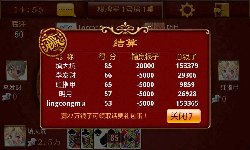 A=15分,K=13分,Q=12分,J=11分,10=10分,9=9分,将玩家手中5张牌的分数相加,和数最大者获胜。三张同点牌另加30分,然后再将5张牌分数相加得出总分,和数最大者获胜。四张同点牌另加60分,当玩家持有四张时,则直接算最大,只有另外玩家也持有四张时,才详细比较得分,三张以下正常算分。多个玩家手中的分数相同时,俗称“烂锅底”,则本盘所有的下注不动,累加到下一把游戏中,直到有人获胜拿走全部赌注。