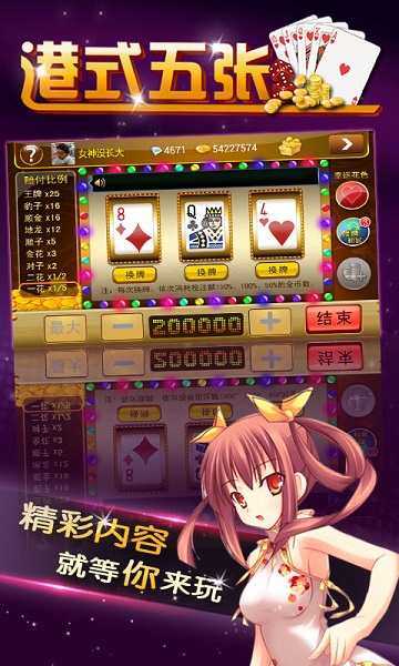超赌神级别规模,让你受尽万人膜拜!身临其境,真实体验赌场豪掷千金的快感!屌丝翻身高富帅尽在一局之间!把把都是梭哈的感觉,心跳不止一点点!换牌卡、透视卡、占卜卡玩到港式五张的最高境界!海量金币和道具卡奖励,你敢玩我就敢送!!