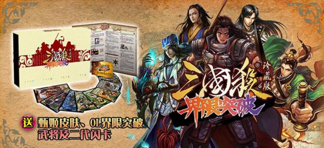《三国杀界限突破》全称为《三国杀标准版·界限突破》,是2014年4月游卡桌游推出的《三国杀》新产品,在2013年发售的《三国杀标准版》的基础上修改了18张武将牌,新增了3张武将牌,共计30个武将,同时又增加了一张游戏牌:木牛流马(装备牌/宝物牌)及一张体力牌(2/3体力),玩家们在《界限突破》中可以体验到不同以往强度的武将技能及全新的武将形象。
