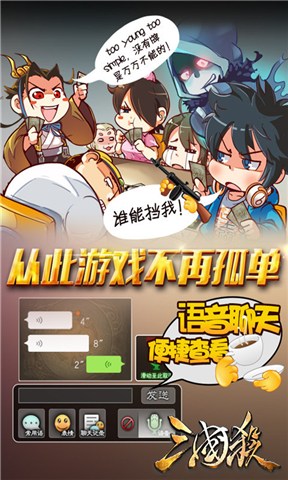 【百名武将,技能各异,变化万千】将历史与游戏完美结合,三国时期诸侯将相、英雄美人系数登场,技能各异,新意不断!收集系统尽揽三国杀武将生平、配音、原画、成就,【最经典——身份场】联网作战,五人、八人局任选,随机扮演“主公”、“忠臣”、“反贼”、“内奸”,与百万玩家在线PK!【最快速——欢乐1V1】单武将作战,快速竞技,随时随地快速杀一局,连胜赢元宝奖励!【最颠覆——国战模式】三国杀全新玩法,魏、蜀、吴、群,势力争雄,双将配合、逆天绝杀,清除所有敌对势力!【最欢乐——欢乐场】2v2、3v3欢乐场,和小伙伴无限畅玩,不怕神一样的对手,就怕猪一样的队友!【最斗智——竞技模式】1V1、新1V1、1V3、比赛……多种PK模式,菜鸟练手,高手过招,一决雌雄!【最免费——神话再临】“风火林山”扩展包免费体验,每周末定时开放,无限畅玩!【趣味聊天】游戏大厅自由聊天,支持私聊和喇叭,趣味游戏内语音聊天、配音台词任你发
