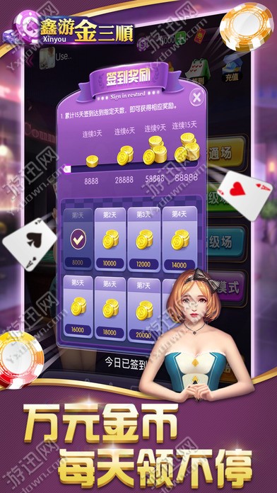 鑫游金三顺是最受玩家喜爱的一款炸金花游戏,游戏有普通场、初级场等等场次,玩家可以自由选择,每天登陆游戏签到还可以领奖励哦!金三顺,又名炸金花、诈金花、飘三叶、赢三张或拼三张,公认的最受欢迎的三张牌游戏。最受欢迎的的炸金花游戏,一款广泛流行的休闲棋牌游戏,挑战您的智慧和运气。以手中的三张牌,通过独特的比牌规则,比较大小来定输赢。鑫游金三顺游戏简介: