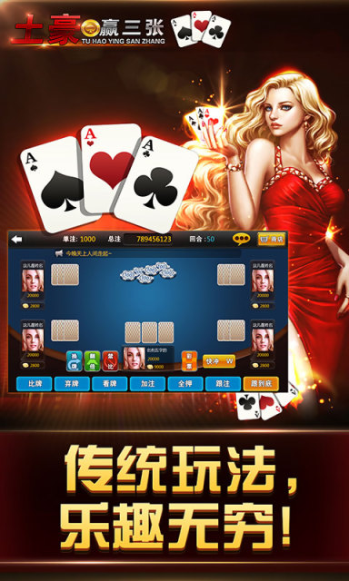 土豪赢三张最新版是一款让你一键进入体验超流畅爽快爆屏的竞技类斗地主游戏,本作更有美艳动人的荷官陪你全场在线挑战,这里将会由你来坐庄,赶紧来Hold住全场吧!游戏中推陈出新的玩法才能俘获玩家的心,游戏保留标准的玩法外,还新增了“千王场”、“万人场”、“娱乐场”,在此都能体验一把尔虞我诈的刺激快感,下一个赌神就是你!进入《土豪赢三张》,首先进入眼前的就是三位非常亮眼的美女,具有极大的视觉冲击力,三位美女每个美女都代表着不同玩法的场次,“标准场”“千王场”“万人场”;这三个场内分别又有“初级场”“中级场”“高级场”,这些等级是根据玩家具有的金币财富来划分的,最高等级的就是最顶级的土豪专属场,里面凝聚了各地土豪,一决高下,冲榜争荣。“标准场”里面没有道具,就是正常玩家比牌;“千王场”内设多种道具,玩家可以利用道具进行玩牌,需要更多技巧与其他玩家进行对决比牌;“万人场”押注翻倍赢金币,也是最刺激赢最多的场次,让你拥有一夜做土豪的快感,可以自己申请做庄,镇压全场,具有身临赌场刺激。最新“美女主播场”,美女视频聊天,面对面陪你玩牌,聊天,你还可以给你心爱的美女送礼物哦!美女金钱让你应有尽有,土豪就这样炼成的,是不是很有诱惑呢?土豪赢三张最新版游戏特色