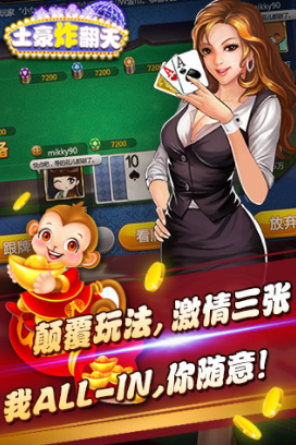 土豪炸翻天是一款极具特色的棋牌类手机游戏,以扑克玩法为主,简洁精致的游戏界面,规则简单易上手的游戏玩法,还有美女主播全程在线陪你玩哦!心动不如行动,赶快加入吧!土豪炸翻天游戏简介土豪炸翻天游戏取自经典的三张牌比大小玩法,融入了趣味而夸张的风格与特色;下载突破500万次,万人火爆在线,土豪,美女,陪你激战到天亮。更有海量话费,时尚手机大礼包等您来赢取!骚年,还在犹豫神马?土豪炸翻天游戏特色主播场--性感主播陪你嗨到底土豪场--任性土豪陪你一掷万金闷牌场--够胆就来闷到底激情场–你敢ALLIN我敢跟