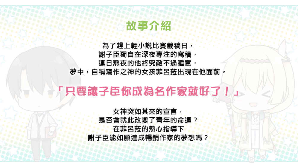 為了趕上輕小說比賽截稿日,謝子臣獨自在深夜專注的寫稿,連日熬夜的他終究敵不過睡意,夢中,自稱寫作之神的女孩菲呂菈出現在他面前。「只要讓子臣你成為名作家就好了。」女神突如其來的宣言,是否會就此改變了青年的命運?在菲呂菈的熱心指導下謝子臣能如願達成暢銷作家的夢想嗎?遊戲介紹《花落冬陽》有病特別篇-在夢中尋求寫作之神的幫忙是否搞錯了什麼?-遊戲類型:新感覺有病追夢AVG遊戲時數:約30分鐘結局數量:3個結局+一個隱藏特典※本作為原創戀愛AVG《花落冬陽》的特別番外篇內容與本篇無關,可獨立觀看遊戲特色?台灣知名輕小說家「小鹿」主筆編劇?角色全語音?多結局?有病、歡樂、搞笑風格?可自由切換的特殊性轉系統(?)?支援繁簡雙語?完全免費遊玩※備註※支援Android4.3以上版本