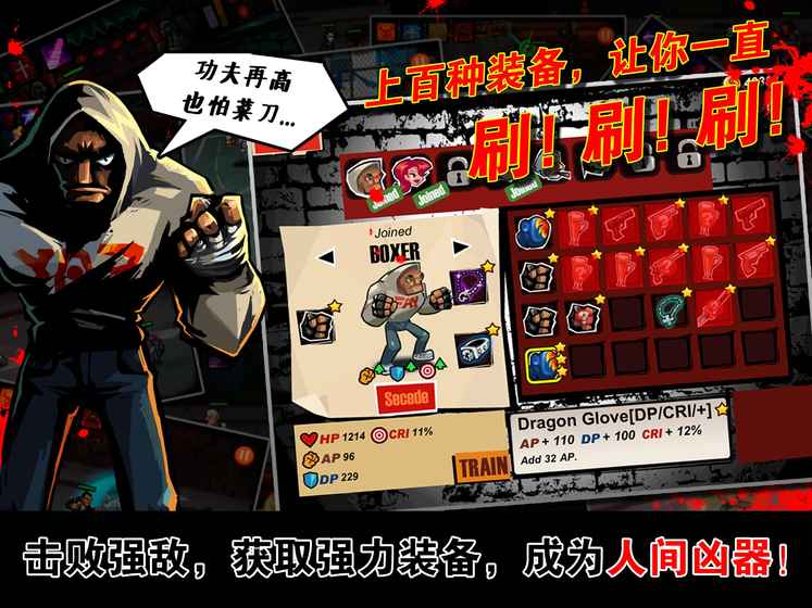 最血腥的黑帮之战已经开始!最新型的ARPG已经来临!武装你的黑帮,学习多种技能,为每名帮派成员赢得上千种不同等级的装备!面对各种各样的敌人,在街头血战。击溃强敌,夺取他们全部的地盘!拳手、酒吧女、枪手、太刀妹、兽王、功夫、朋克和吸血鬼,从他们之中选择四人,培养他们的能力,强化他们的技能。最强大的黑帮正在崛起。带领你的帮派征服5大街区的60个地盘吧!看谁才是暴力街区最终的幸存者!-画面精美绚丽,人物动作丰富流畅。-拳拳到肉的打击感,击飞、眩晕、劈刺等各种特效绝对过瘾。-提供8个不同风格的黑帮成员选择,你可搭配出罪恶街区最强大的队伍。-上百种效果惊艳的技能供角色学习,可培养出不同战斗风格的各类角色。-几千种装备组合搭配,强大的纸娃娃系统,改变角色外观,塑造最酷的外型。-可达成数十种称号成就,装备不同的队伍加成,加强战队的整体实力。-恐怖的Boss在巢穴中静静等待你的到来。敌如潮涌的竞技场隐藏着最逆天的装备。只有罪恶街区的强者,才能征服一切。-同时支持中、日、英、韩四种语言。Email:cs@blackpearlgame.comFacebook:http://www.facebook.com/BlackPearlGames