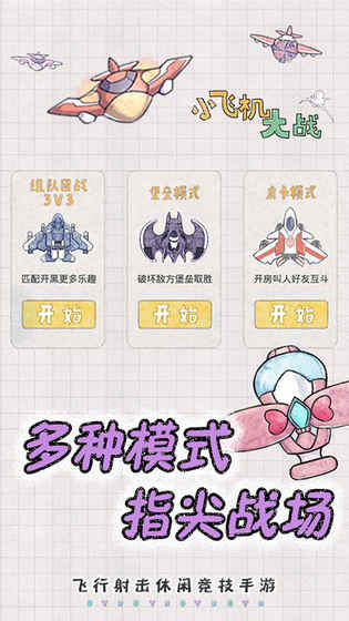 一款耳目一新、轻松带感的IO类飞行射击游戏,洗尽铅华,带你沦陷最纯粹的打飞机乐趣。包体轻小,画风清新,道具信手画出,瞬间回归记忆中一起涂鸦一起折纸飞机的童年时光。蠢萌的外表下蕴藏着随时燃炸星际的空中机战能量,多种机型,多种武器,你可以多模式、多任务的实时炫技对抗,也可以呼朋唤友3V3组团相爱相杀,更可以挑战每月排位赛,9大段位进阶超神,飞机迷们在这里一定过足收集瘾!机长们,登机啦!与我们一同起航,开启一段非同凡响的打飞机之旅!